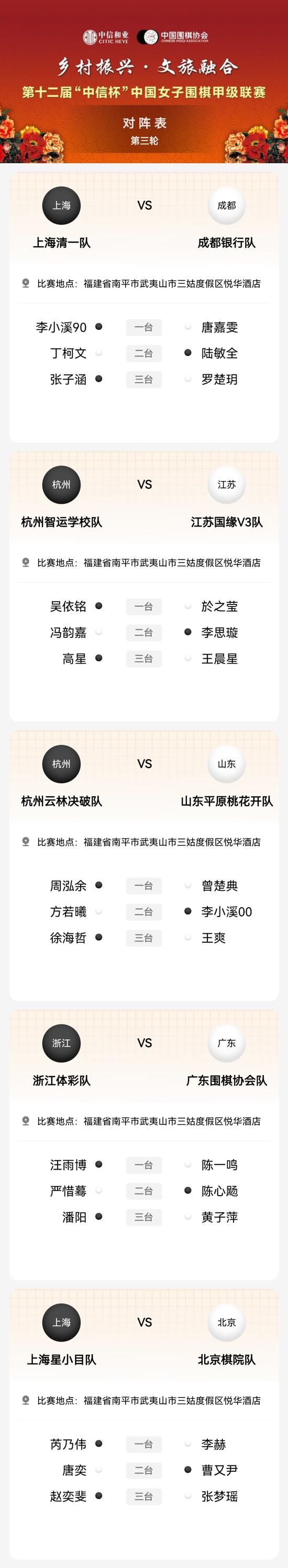5月15日,2025年第十二届“中🚞信杯”中国女子围❕棋甲级联赛福建·武夷山站第二轮比赛在武夷山悦华酒店🌔结束。杭州云林决破队🕡3比0战胜广东围棋协🕯会队,前两轮取得全胜,位居积分榜首位。上😆届冠亚军之战,成都银