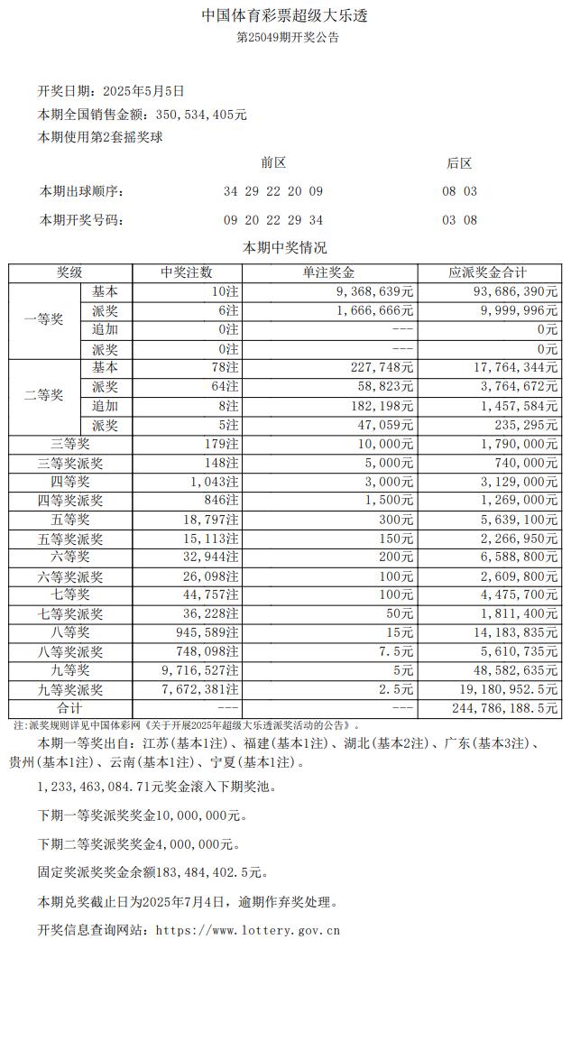 北京时间5月5日晚,体彩超级大乐透第25049期开奖,同时本期也是大👙乐透8.8亿大派奖活动的第12期,当期开奖号码为:09 20 22 29 34 03 08。