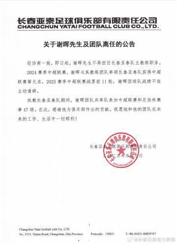 💸👛 经协商一致,即日🤑起,谢晖先生不再担任长春亚泰队主教练职务。2024赛季中超联赛,谢晖与其教练团队率领长春