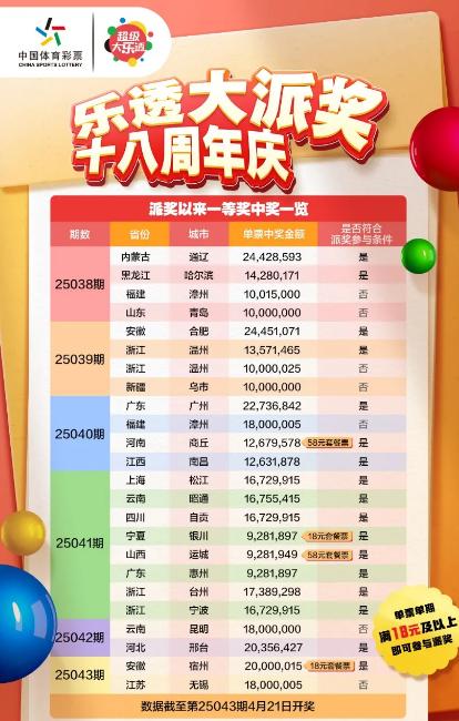 🗒北京时间4月23日🚓晚间,�🚞�体彩超级大乐透即将迎来💨派奖第7期(即第25044期📽)开奖,此前8.8亿大派奖6期累计开出🍽24注🤏1等,最高奖金是第2503🅰9期来自安徽合肥2445万