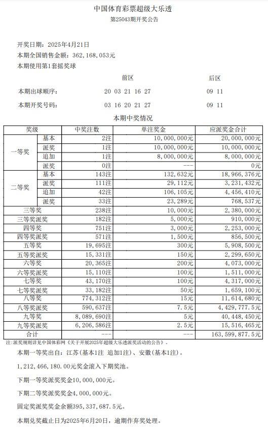本期全国共开出2注一等奖,单注奖金1000万元,其中1注✍为追加投注,多得800万元奖金,追加头奖单注1800万元,花落江苏。另外1注🦡基本头奖派奖,单注2000万元,花落安徽。
