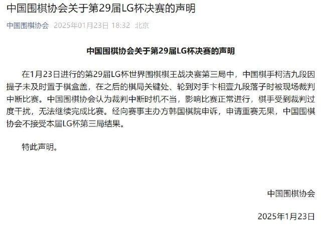 随后,中国围棋协会发布🆔声明,认为裁判中👌断时机不当,影响比赛正常进行,棋手受到裁判过度干扰,无法继续完成比赛。该声明表示:“经向赛事主办方韩国棋院申诉,申请重赛👒无果,中☮⚰国围棋协会不接受本届lg杯第三局结果。”