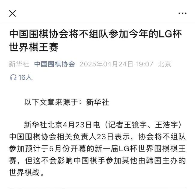4月23日,新华社发文“中国围棋协会相关负责人23📪日表示,🚝协会将不组队参加预计于5月份开幕的新一届lg杯世界围棋棋王赛,但这不会影响中国🤳棋手参加其他由韩国主办的世界棋战。”
