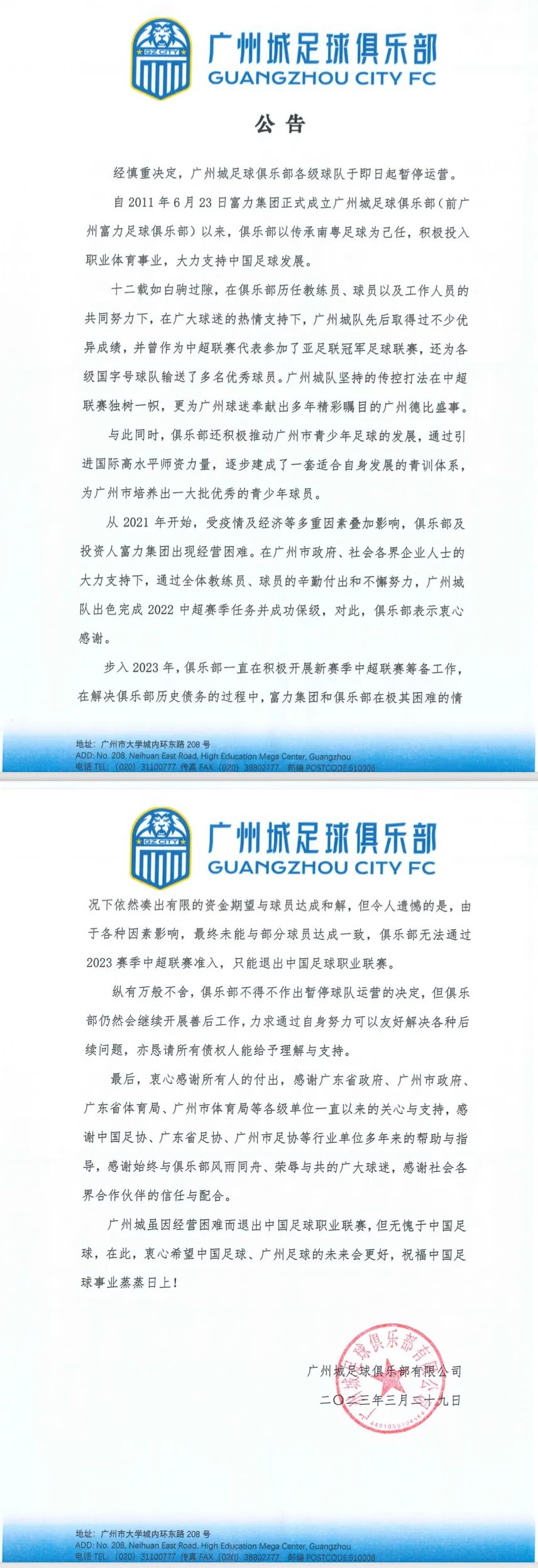⚖ 3月29日,广州城🏡足♊球俱乐部公众号发🤠布《关于广州城足球俱乐部暂停🍣