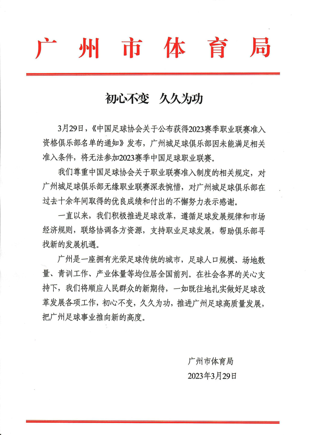 同日,广州市体育局发布《初心不变 久久为功》文章�💈�👝,对广州城足球俱乐部无缘职业联赛深表惋惜,对广州城足球📁俱乐部在过去十余✋年间取得❇的优良成绩和付出的不懈💌努力表示感谢。🔂文章全文如💧下。
