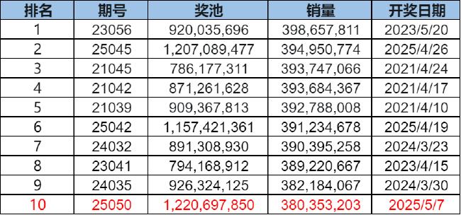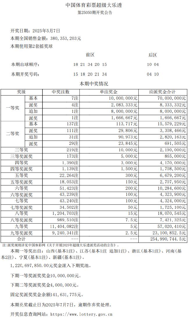 本期全国销🤡量为3.80亿元,奖池方面,本期开奖结束后,12.20亿元滚存至5月10日(周六)开奖的第25051期。