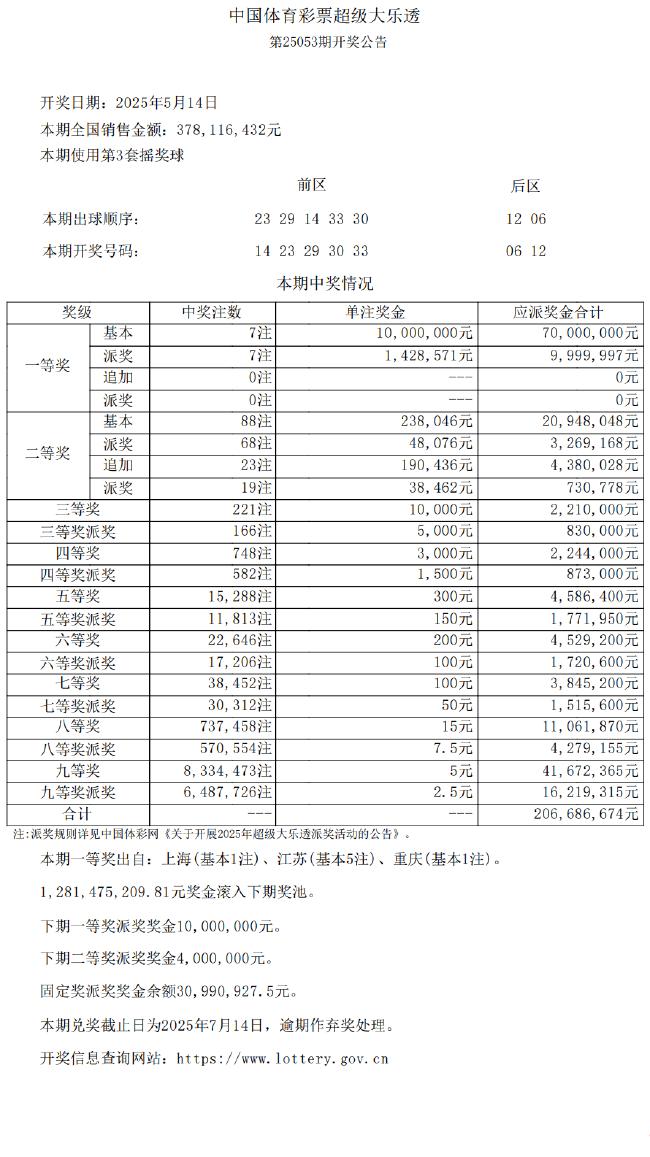 北京时间5🦷月14日晚,体彩超级✏大乐透第25053期开奖,同时本期也是大乐透🎥8.8亿大派奖活动的第16期,当期开奖号码为:1👣4 23 29 30 33 06 12。