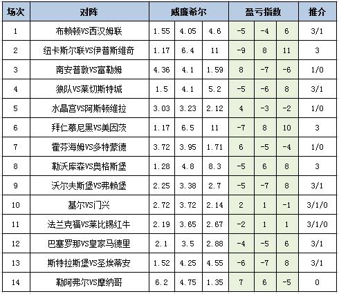 🏯 先来看看盈亏指数中🎀比较重点的几场比赛:纽卡斯尔联vs伊普斯维奇🚂🦄的比赛机构给�🔶�出较多的让步,盈亏指数给出负正正的组合,对于主队有利,本场可以建议关注主队取胜;狼队vs莱切斯特城的🦦比赛机构给出一球的让步幅度,盈亏指数给出负负正的组合,平局的负值♑较高,此役建议重点防平;法兰克福vs莱比锡红牛的比赛机构给出较少的让步,盈亏指数给出负正正的组合,但是正负值差距不大,此役建议全包,任九重点舍弃。