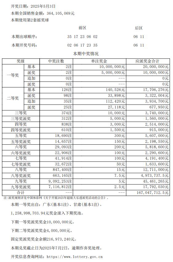 本期全国共开出2注一等奖,单注奖金1000万元,2注均享基本🚝头奖派奖,每注多得500万元,单注奖金达到1500万元,分落广东、甘肃。